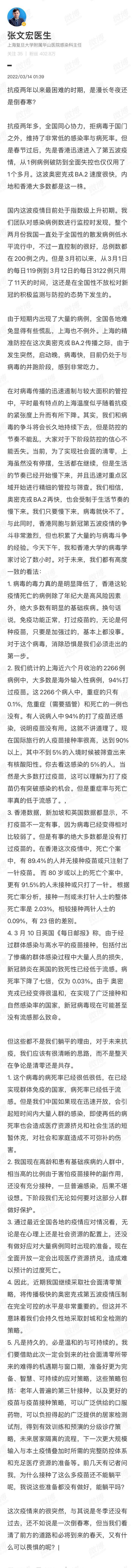 2022年3月14日,国家传染病医学中心主任、上海复旦大学附属华山医院感染科主任张文宏 微博再发千字长文解析疫情,抗疫两年以来最困难的时期,是漫长冬夜还是倒春寒?